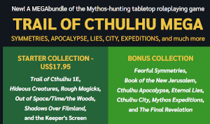 From the depths a new Megabundle arises, with enough savings to drive a boat through. Grab the Trail of Cthulhu Megabundle from Bundle of Holding before it sinks beneath the waves. $17.95 for eight titles including the core book, or beat the current threshold to add another seven.
